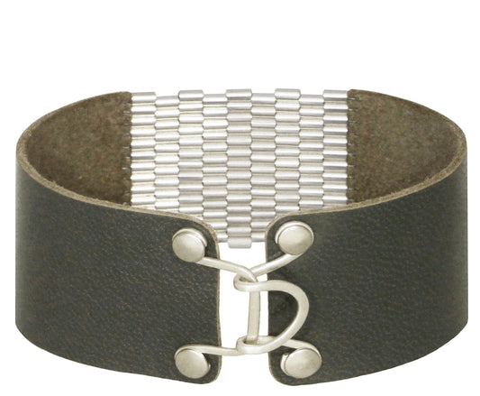 1" Wide Leather Cuffs with Patina Silver Beaded Inlay