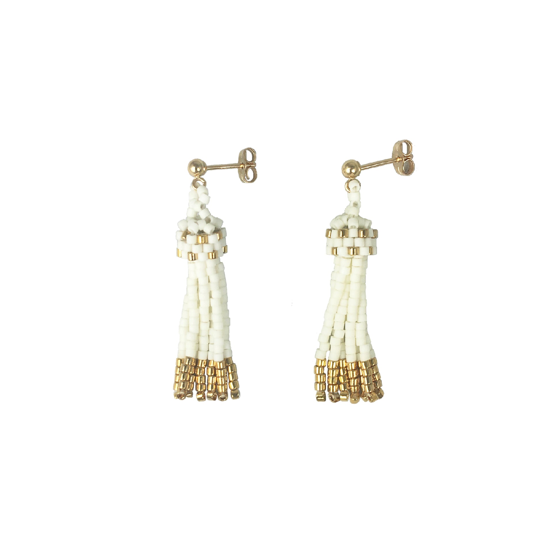 Hand beaded mini tassel earrings made with Japanese Glass beads. Cap and tassel tips feature 24K Gold electroplated accents. 3mm studs in 14K solid Gold.